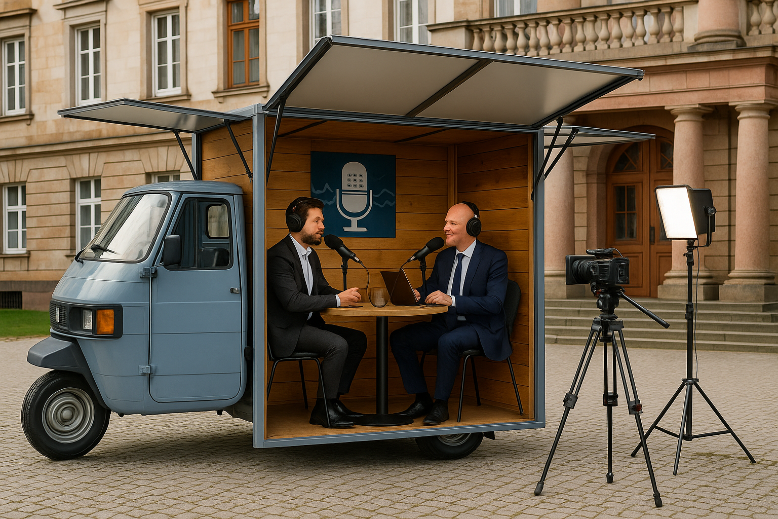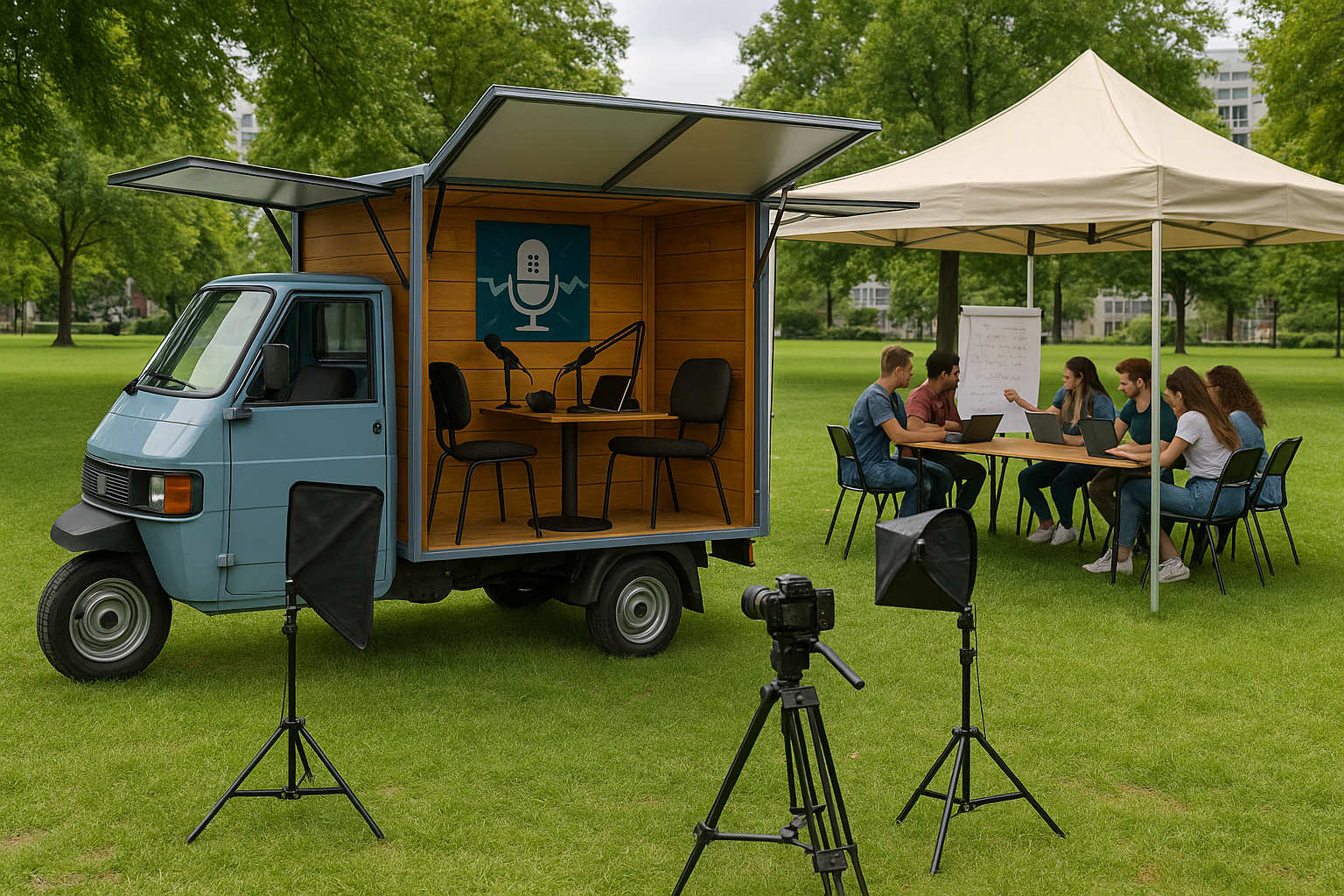 Mit unserem mobilen Studio bringen wir modernste Technik direkt zu Ihnen: Kameras, Mikrofone, Mischpulte und Beleuchtung sind an Bord – alles, was man für professionelle Podcasts und Videoproduktionen braucht. Über Pop-Up-Pavillons lässt sich das Studio flexibel erweitern und schafft so Platz für Workshops und Unterricht im Freien. Ob eigene Projekte, Schulungen oder kreative Experimente: Unser Studio kann auch für die Produktion individueller Formate angemietet werden.